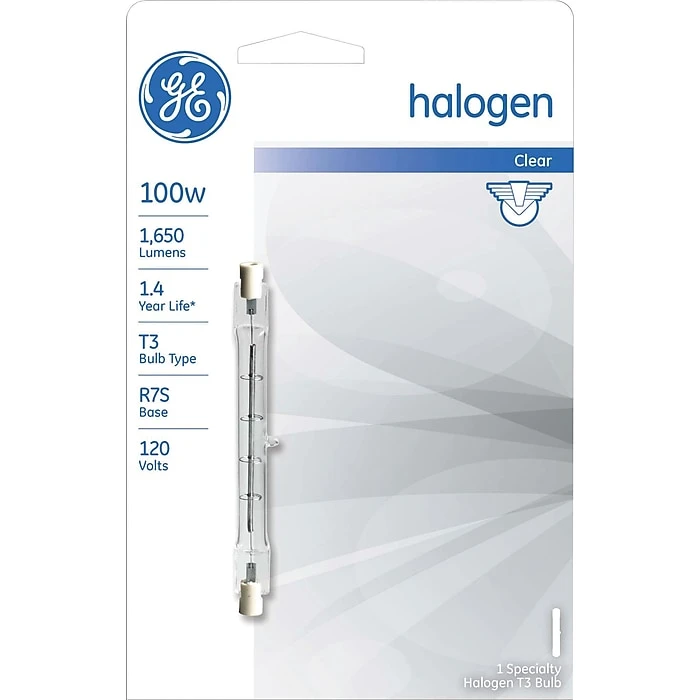 GE 100 W T-3 Double ended halogen light bulb in clear color delivers crisp white light and is perfect for adding dramatic touch to your room/space. Bulb can be used for torchiere, motion-sensing and security applications.
