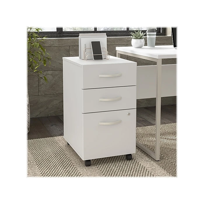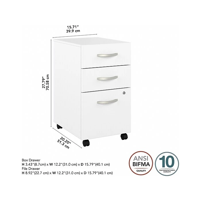 The Bush Business Furniture Hybrid three-drawer mobile file cabinet offers a stylish, long-lasting storage solution for the modern professional. Enjoy a neat and organized workspace with a file cabinet that conveniently rolls wherever you need access to important documents and supplies. The file drawer opens on smooth full-extension ball bearing slides for an effortless reach to letter-, legal-, and A4-size paperwork, while a pair of box drawers organize writing utensils, notepads, and more. The two bottom drawers can be secured by a single lock to protect sensitive files or personal items. The rolling file cabinet’s compact design allows it to fit underneath a standard-size office desk for a space-saving configuration. Find the perfect look for your space with five contemporary finish options: black walnut, modern hickory, platinum gray, storm gray, and white. This three-drawer file cabinet with wheels has been meticulously tested to meet or exceed ANSI/BIFMA quality standards for safety, durability, and performance and is backed by the Bush Business Furniture 10-year manufacturer warranty. See the full Bush Business Furniture Hybrid collection for coordinating items to enhance your workspace as needed, including computer desks, bookcases, and storage cabinets (coordinating items sold separately). American-made with US and imported parts.