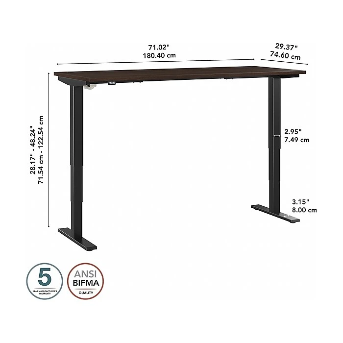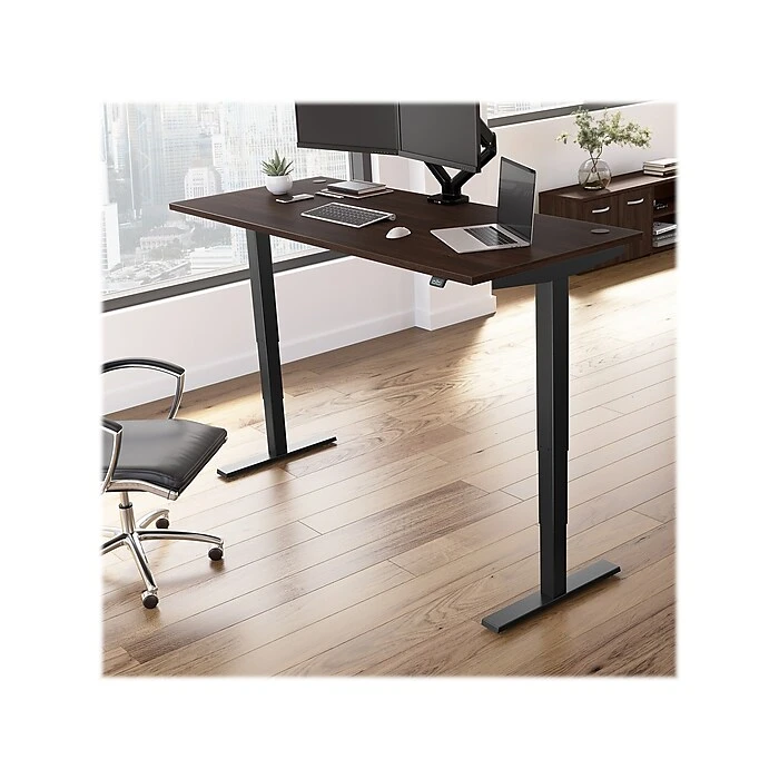 The Bush Business Furniture Move 40 height-adjustable standing desk is a perfect way to build an ergonomic workspace without the high-end price tag. Give your body and mind a break from sedentary work, and enjoy a healthier, more productive office with the push of a button. Three-stage units lift the desktop anywhere from 28″ to 48″ at a speed of 1.25″ per second, so you can change positions without missing a beat. The adjustable desk also features an anti-collision sensor that stops movement up or down if an object is detected. Available in several attractive finishes, the durable thermally fused laminate work surface resists scratches and stains, while a welded 16-gauge steel base allows the desktop to support up to 176 lbs. This sit-stand desk is tested to meet the ANSI/BIFMA quality standards for safety and performance and is backed by a 5-year manufacturer warranty.