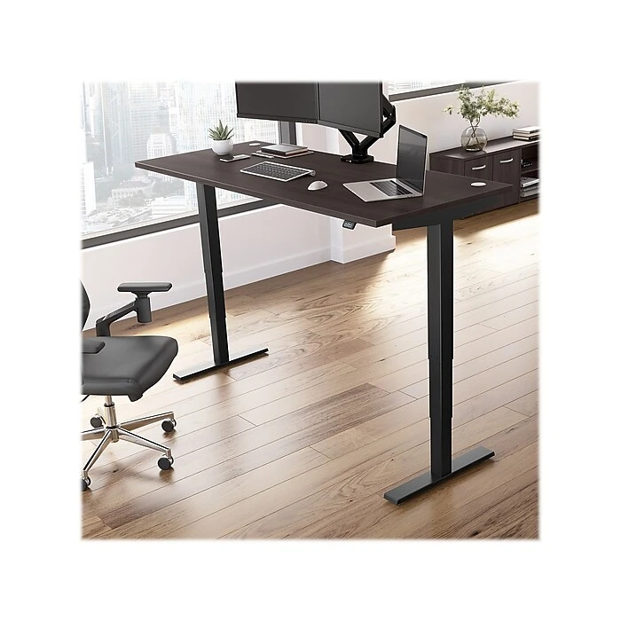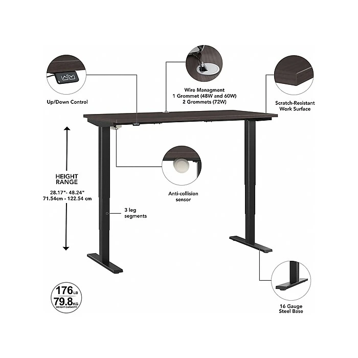 The Bush Business Furniture Move 40 height-adjustable standing desk is a perfect way to build an ergonomic workspace without the high-end price tag. Give your body and mind a break from sedentary work, and enjoy a healthier, more productive office with the push of a button. Three-stage units lift the desktop anywhere from 28″ to 48″ at a speed of 1.25″ per second, so you can change positions without missing a beat. The adjustable desk also features an anti-collision sensor that stops movement up or down if an object is detected. Available in several attractive finishes, the durable thermally fused laminate work surface resists scratches and stains, while a welded 16-gauge steel base allows the desktop to support up to 176 lbs. This sit-stand desk is tested to meet the ANSI/BIFMA quality standards for safety and performance and is backed by a 5-year manufacturer warranty.