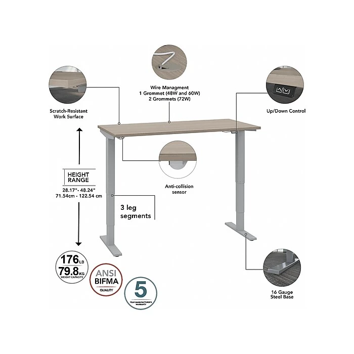 The Bush Business Furniture Move 40 electric height-adjustable standing desk is a perfect way to build an ergonomic workspace without the high-end price tag. Give your body and mind a break from sedentary work, and enjoy a healthier, more productive office with the push of a button. Three-stage units lift the desktop anywhere from 28″ to 48″ at a speed of 1.25″ per second, so you can change positions without missing a beat. The adjustable desk also features an anti-collision sensor that stops movement up or down if an object is detected. Available in several finishes, the durable thermally fused laminate work surface resists scratches and stains, while a welded 16-gauge steel base allows the desktop to support up to 176 lbs. This sit-stand desk is tested to meet ANSI/BIFMA quality standards for safety and performance and is backed by a 5-year manufacturer warranty.