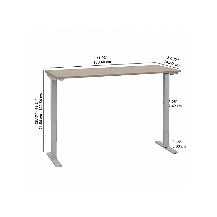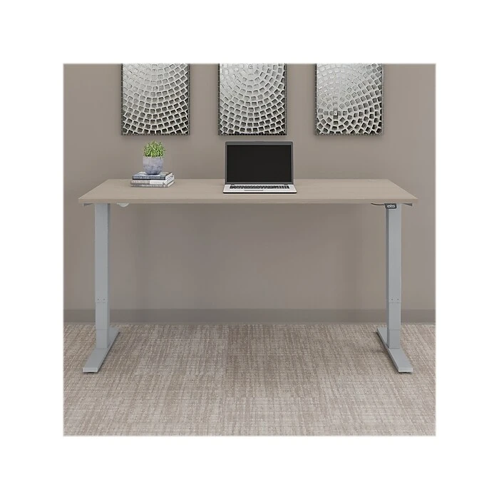 The Bush Business Furniture Move 40 electric height-adjustable standing desk is a perfect way to build an ergonomic workspace without the high-end price tag. Give your body and mind a break from sedentary work and enjoy a healthier, more productive office with the push of a button. Three-stage units lift the desktop anywhere from 28″ to 48″ at a speed of 1.25″ per second, so you can change positions without missing a beat. The adjustable desk also features an anti-collision sensor that stops movement up or down if an object is detected. Available in several finishes, the durable thermally fused laminate work surface resists scratches and stains, while a welded 16-gauge steel base allows the desktop to support up to 176 lbs. This sit-stand desk is tested to meet ANSI/BIFMA quality standards for safety and performance and is backed by a 5-year manufacturer warranty.