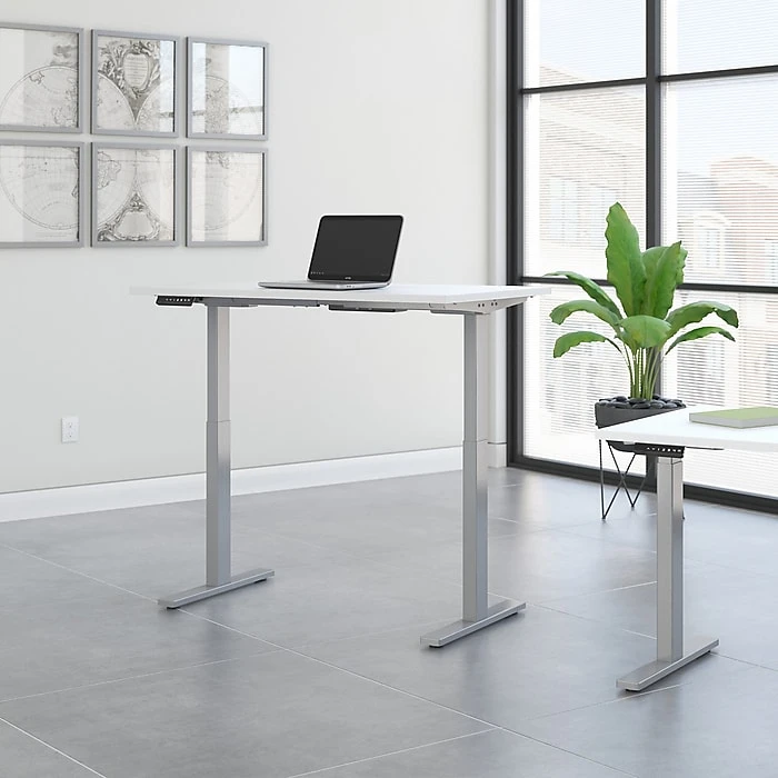 Have a healthy and productive day at the office with the Move 60 by Bush Business Furniture 48W x 24D Height Adjustable Standing Desk. Those who use sit to stand desks report improved attitudes, energy and comfort while getting more done, and the Move 60 provides an affordable solution. The electric adjustable height Desk smoothly lifts from a low of 27 inches to a high of 46.7 at the push of a button. Store your favorite heights with four programmable presets. The ergonomic Desk withstands years of everyday use. A durable thermally fused laminate finish resists scratches and stains, while the sturdy steel base creates a weight capacity of up to 200 pounds. This sit to stand Desk will have no problem holding all of your work materials. Backed by a 5 Year Warranty, the Height Adjustable Standing Desk meets ANSI/BIFMA quality test standards.
