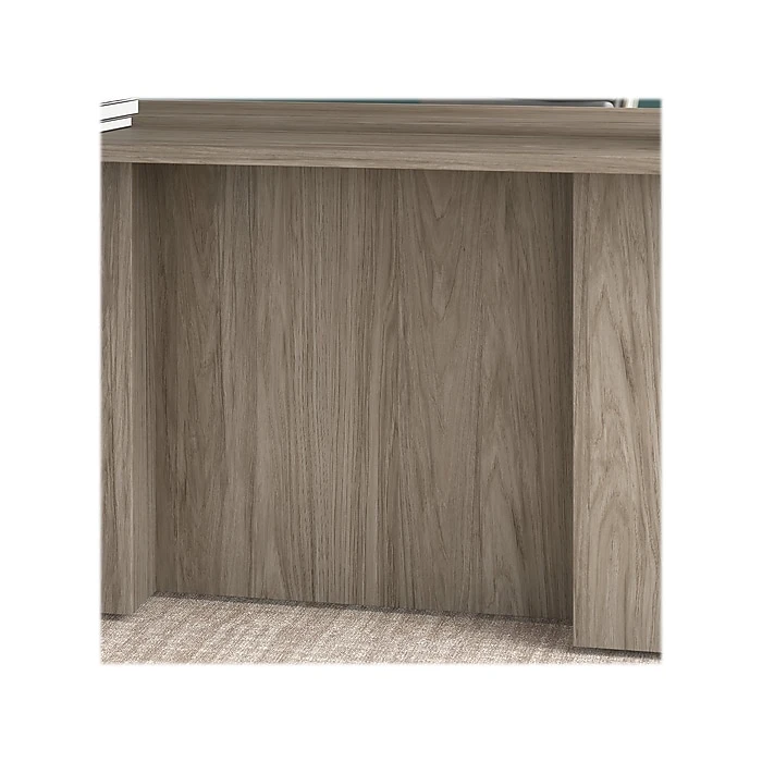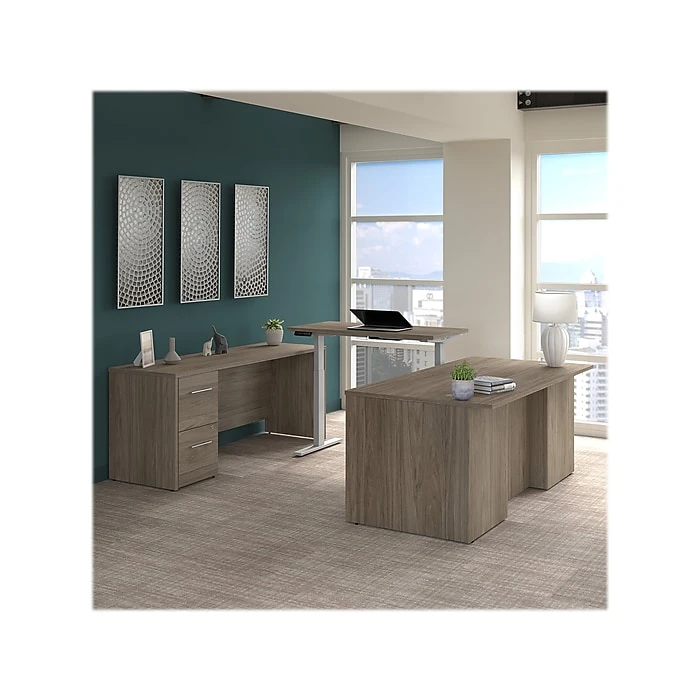 The Bush Business Furniture Office 500 72″W height-adjustable U-shaped executive desk with drawers offers an ergonomic workspace with professional style. With its impressive breakfront design and the flexibility to sit or stand at the push of a button, this executive desk presents a perfect workspace for the modern professional. Take a prominent position in your private office as you spread out on a spacious wraparound desk with built-in wire management. The 48″W x 24″D height-adjustable standing desk lifts anywhere from 27″ to 47″ and includes four presets that allow you to change positions quickly and easily throughout the day. Two lockable file cabinets fit under the fixed desktop for easy access to legal-, letter-, and A4-size paperwork and supplies. This adjustable desk with storage is tested to meet ANSI/BIFMA standards for safety and performance.
