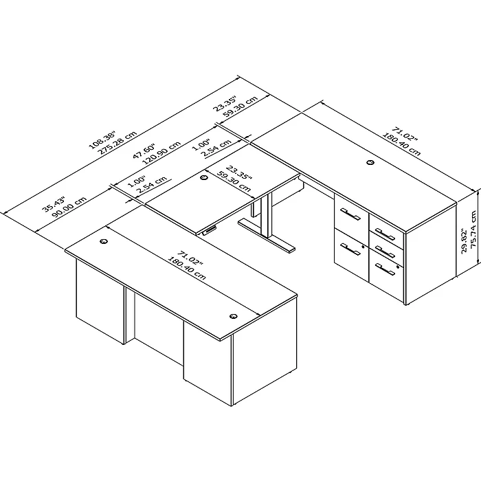 - Bundle includes: 71.02″W x 35.43″D executive desk, 71.02″W x 23.35″D credenza desk, 47.6″W x 23.35″D height-adjustable standing desk, 16″W three-drawer file cabinet, 16″W two-drawer file cabinet
