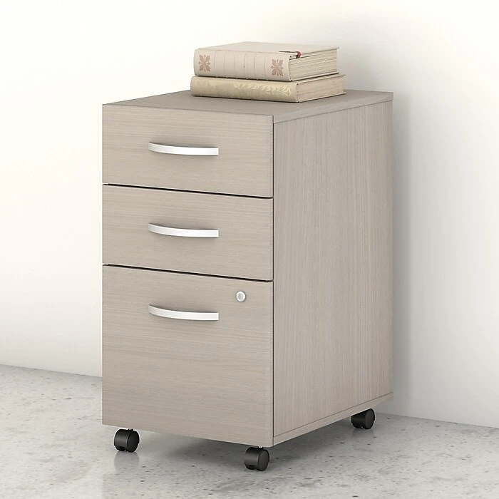 Designed to keep materials nearby, the Bush Business Furniture Studio C three-drawer mobile file cabinet features professional quality with a contemporary feel. The cabinet rolls with you throughout your office or remains in place as needed on any surface. You’ll have your letter-, legal-, and A4-size paperwork organized almost in no time as the file cabinet ships partially assembled. Its two box drawers hold your pens, notepads, and small office supplies. The file drawer opens on full-extension ball bearing slides, making it easy to reach papers at the back. Dual-wheeled, hooded casters keep the three-drawer cabinet moving on your floor or carpet. A single lock secures the bottom two drawers to protect sensitive paperwork and personal items. Eye-catching brushed nickel drawer pulls complement your choice of several contemporary or traditional finishes. The mobile file cabinet comes with a 10-year manufacturer limited warranty and meets ANSI/BIFMA quality test standards. American-made with US and imported parts.