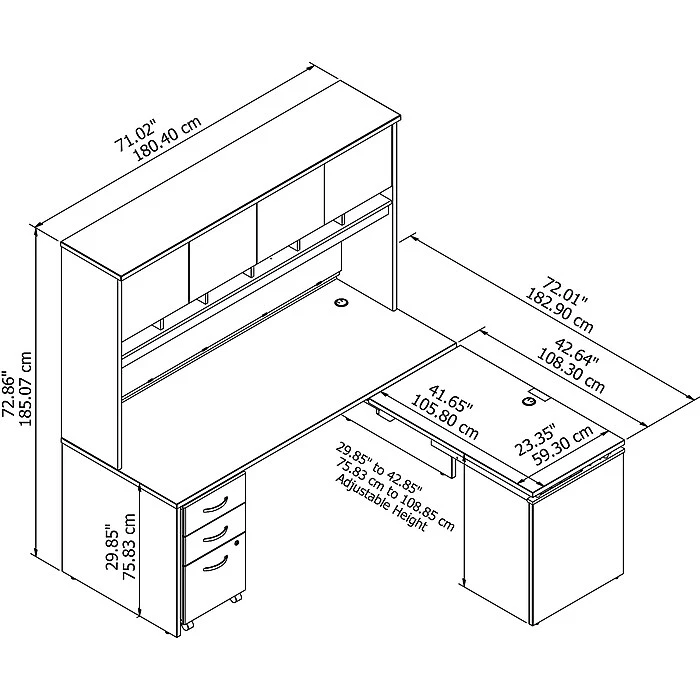 - Bundle includes: 72W x 30D Office Desk, 42W x 24D Sit to Stand Return, 72W Hutch, 3 Drawer Mobile File Cabinet
