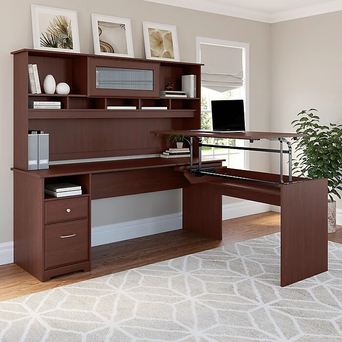 The Bush Furniture Cabot L Shaped Sit to Stand Desk with Hutch turns your home office into an ergonomic workstation. With a wide work surface you’ll enjoy plenty of room for multitasking, and you can save space as the adjustable desk fits perfectly in a corner. Smoothly lift and lock the Return desktop to standing height positions of 36, 39 or 42 inches from the floor and work comfortably, or use the easy adjustability and have a seat when your legs get tired. The Return desktop holds up to 20 pounds when at standing height so you can bring materials with you when you need to stretch your legs. Organize your workspace with a box drawer and cubby for supplies, along with a full-extension file drawer. The Hutch offers a beautiful flip-up door and includes open storage space for books or decorations. Backed by a Bush Furniture 1 Year Manufacturer’s Warranty.