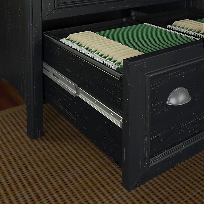 Blend style and functionality in your home office with the Bush Furniture Fairview 2 Drawer Lateral File Cabinet in Antique Black. The charming Hansen Cherry top surface and beautiful Antique Pewter hardware accents blend perfectly with existing decor. Height matches the Fairview Computer Desk (sold separately) for an extended work surface when positioned side-by-side. Full-extension file drawers glide on smooth ball bearing slides for easy access to letter, legal or A4-size files. An interlocking drawer mechanism prevents tipping for added safety. Fairview meets ANSI/SOHO quality test standards for performance and safety and comes with a Bush Furniture 6 Year Manufacturer’s Warranty. With casual styling and traditional detail, Fairview offers an alluring appearance without sacrificing functionality. See the full collection for coordinating home and office items available.