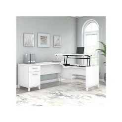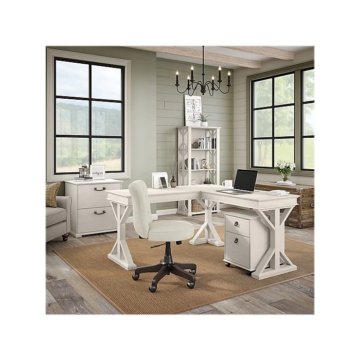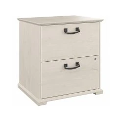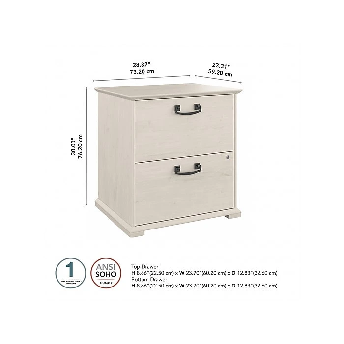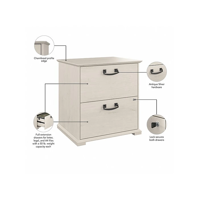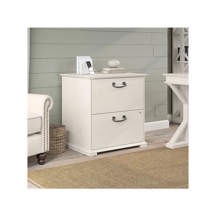 The Bush Furniture Homestead farmhouse-style lateral file cabinet offers a practical storage solution with an appealing modern farmhouse style. This filing cabinet utilizes Tip Guard safety features that include a stable design, a counterweighted back panel, wall attachment hardware, and safe-open drawers. Locking file cabinet’s drawers pull out one at a time for safe use and each support up to 50 lbs. Full-extension ball bearing slides provide easy-reach access to the letter-, legal-, and A4-size paperwork. A single lock secures both drawers for your privacy. Decorative trestle patterns, chamfered profile edges, and antique silver hardware give this cabinet a casual farmhouse style. This file cabinet has been tested to meet the ANSI/SOHO quality standards for safety and performance and is backed by a 1-year limited warranty. See the complete Homestead collection for more items.