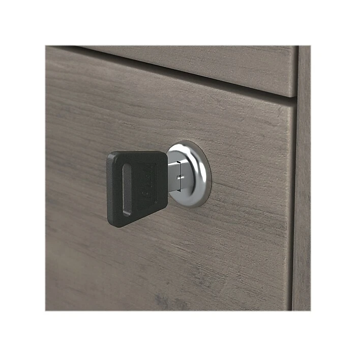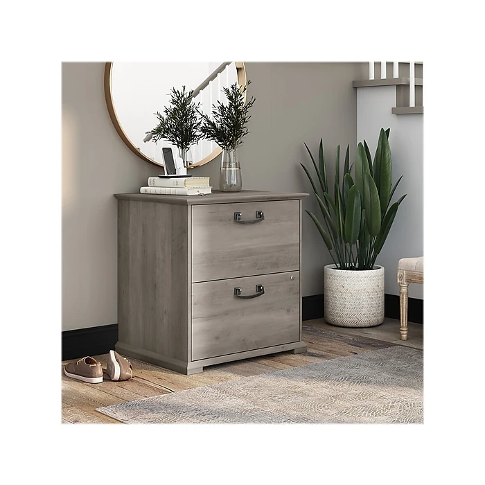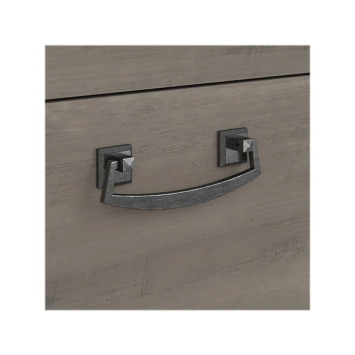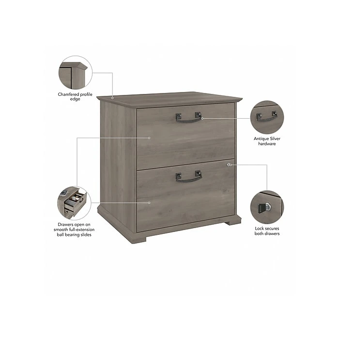 The Bush Furniture Homestead farmhouse-style lateral file cabinet offers a practical storage solution with an appealing modern farmhouse style. This filing cabinet utilizes Tip Guard safety features that include a stable design, a counterweighted back panel, wall attachment hardware, and safe-open drawers. Locking file cabinet’s drawers pull out one at a time for safe use and each support up to 50 lbs. Full-extension ball bearing slides provide easy-reach access to the letter-, legal-, and A4-size paperwork. A single lock secures both drawers for your privacy. Decorative trestle patterns, chamfered profile edges, and antique silver hardware give this cabinet a casual farmhouse style. This file cabinet has been tested to meet the ANSI/SOHO quality standards for safety and performance and is backed by a 1-year limited warranty. See the complete Homestead collection for more items.
