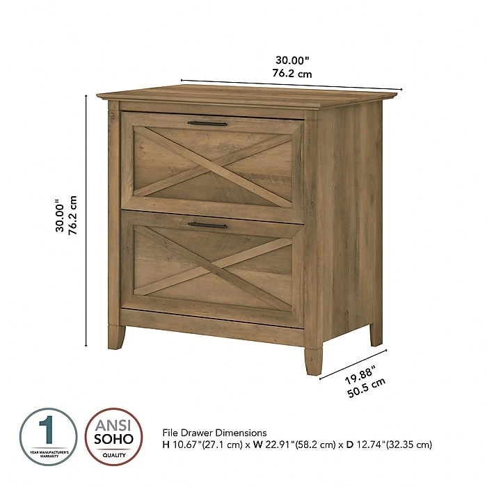 A natural fit for homes that embrace coastal and farmhouse decor, the Bush Furniture Key West two-drawer lateral file cabinet is perfect for organizing paperwork in virtually any room. Two file drawers open on smooth, full-extension ball bearing slides for an easy reach to legal- and letter-size documents. A unique X-pattern accent on the drawer panels creates a relaxed style supported by a sturdy and attractive post-leg design. This lateral file cabinet matches the height of any Bush Furniture Key West desk (sold separately) to create an extended work surface when placed side by side. The Bush Furniture Key West collection offers a wide variety of farmhouse furniture that makes building a complete home office or living room a breeze. This two-drawer file cabinet is tested to meet ANSI/SOHO quality standards for safety and performance and is backed by the Bush Furniture 1-year manufacturer limited warranty.