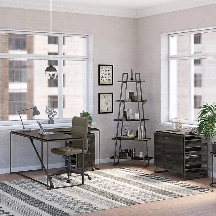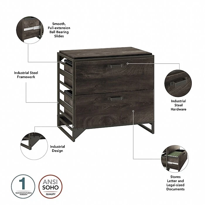 Organize your home office, and express your rustic taste with the Bush Furniture Refinery two-drawer lateral file cabinet. Featuring an open industrial steel frame along with matching hardware and exposed bolts, this lateral file cabinet combines a reclaimed feel with complete convenience. Four distressed finishes complement the industrial design. Two full-extension file drawers open on smooth ball-bearing slides for an effortless reach to letter-, legal-, and A4-size paperwork. Perfect for the home office, loft, or creative space, the two-drawer file cabinet matches the height of coordinating Bush Furniture Refinery industrial desks (sold separately) to extend your work surface. This file cabinet has been tested to meet ANSI/SOHO quality standards for safety and performance and is backed by a 1-year manufacturer limited warranty. View the full line of industrial furniture to find the perfect fit for your space.