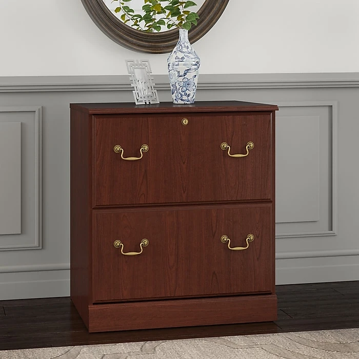 The Bush Furniture Saratoga Lateral File Cabinet offers complete functionality at a lasting value. Full-extension file drawers open on smooth ball-bearing slides for easy access to contents. The Cabinet accepts letter, legal and A4-size files. A lockable upper drawer secures your most important paperwork. Gold-finished Brass hardware and timeless design accents match the traditional styling of your home office or professional workspace. The durable thermally fused laminate finish lasts for years while resisting scratches and stains. An interlocking drawer feature reduces the likelihood of tipping. With heights that match, you can place the Lateral File Cabinet next to a Saratoga desk (sold separately) to extend your work surface. Backed by a 10 Year Warranty, Saratoga meets ANSI/BIFMA performance and safety standards.