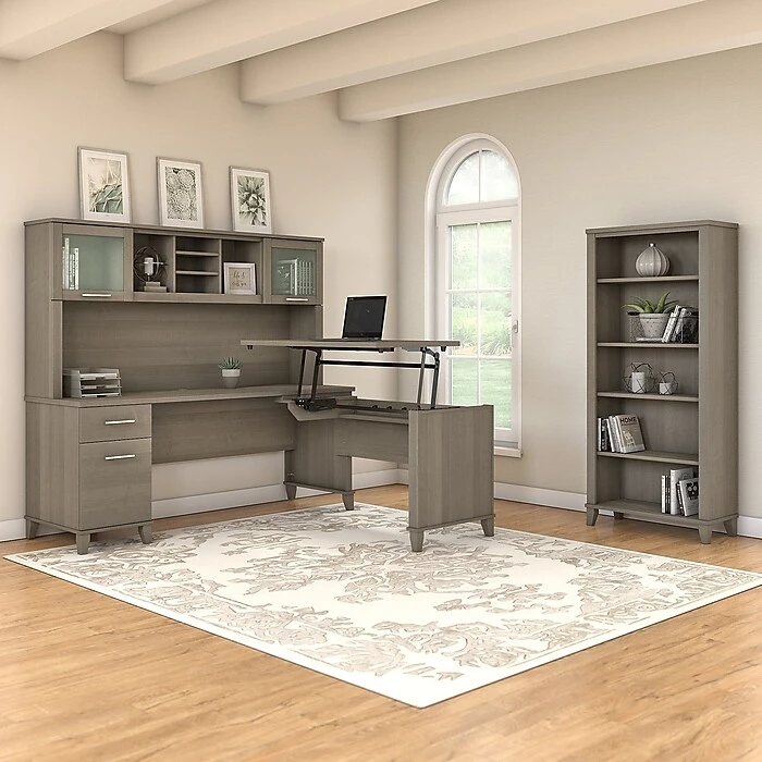 The Bush Furniture Somerset 72W 3 Position Sit to Stand L Shaped Desk with Hutch and 5 Shelf Bookcase offers an ideal solution for those seeking a stylish and functional ergonomic workspace. The mechanical Lift-n-Lock system allows the 42W x 24D Return to lock into place at standing heights of 35, 38, and 41 inches and easily returns to a seated position. The 72W x 24D Office Desk has its own storage with a box drawer for supplies and a file drawer that holds legal and letter size documents. The Hutch adds two frosted glass doors for concealed storage as well as open cubby spaces with two shelves. The Bookcase features two fixed shelves and three shelves that can be adjusted. Fixed surfaces are tested to meet ANSI/SOHO standards for safety and performance while the mechanical lift is rigorously tested to Bush Furniture quality standards. Backed by a 6 Year Warranty.
