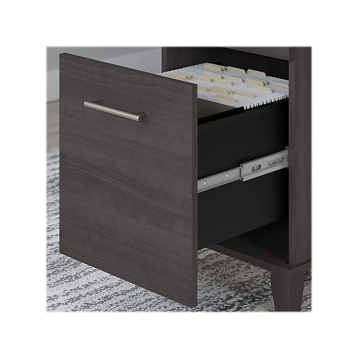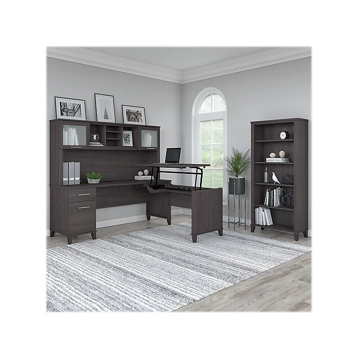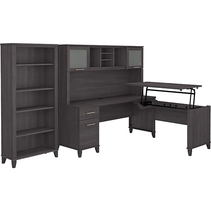 The Bush Furniture Somerset adjustable desk with hutch and bookcase offers an ergonomic solution for the home or small office. This furniture set is a perfect solution for those seeking for a stylish and functional ergonomic workspace. The mechanical Lift-n-Lock system allows the 42″W x 24″D return to lock into place at standing heights of 35″, 38″, and 41″ and easily return to a seated position. The 71″W x 24″D office desk has its own storage with a box drawer for supplies and a file drawer that holds legal- and letter-size documents. The hutch adds two frosted glass doors for concealed storage as well as open cubby spaces with two shelves. The bookcase features two fixed shelves and three shelves that can be adjusted. Fixed surfaces are tested to meet ANSI/SOHO standards for safety and performance while the mechanical lift is rigorously tested to Bush Furniture’s own quality standards. Backed by a 6-year manufacturer warranty.