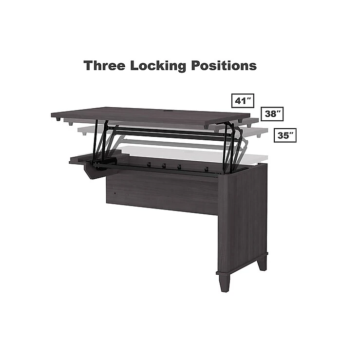 - Lift-n-Lock Desktop can be set at 3 standing height positions: 35, 38 or 41 inches and easily returns to seated height