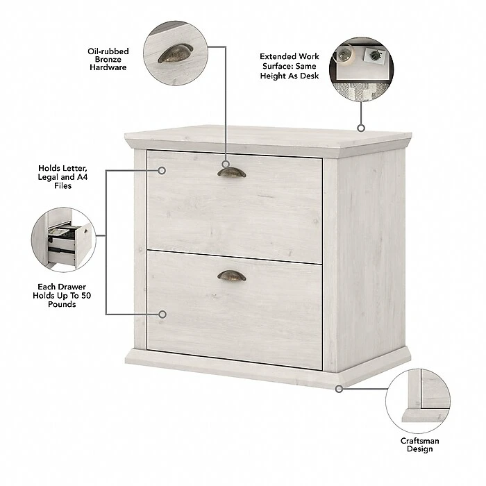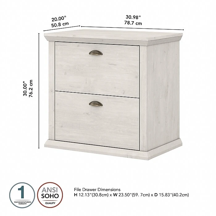 The Bush Furniture Yorktown two-drawer lateral file cabinet presents a stylish and practical solution for organizing documents in any work or living space. Two file drawers open on smooth full-extension ball bearing slides for an effortless reach to letter-, legal-, and A4-size paperwork. The drawers are designed to extend one at a time for maximum stability on both hard and carpeted surfaces, and each drawer holds up to 50 lbs. of materials. The two-drawer file cabinet’s height matches that of the Bush Furniture Yorktown L-shaped desk, corner desk, and home office desk to create an extended work surface when positioned side by side. Bush Furniture Yorktown’s classic charm is highlighted by stylish beveled edge detailing and oil-rubbed bronze drawer pulls that complement your choice of finish. This lateral file cabinet is tested to meet ANSI/SOHO standards for safety and performance and is backed by a 1-year manufacturer limited warranty.
