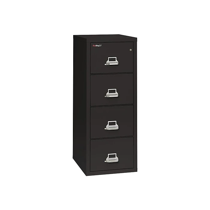 Use this heavily insulated file cabinet to organize letter-sized document folders. The inter-drawer insulation of this cabinet keeps files safe in the event of a fire, and the high-security key lock ensures that documents are for your eyes only. This vertical file cabinet comes equipped with water-resistant technology, which prevents water from damaging files. With four roomy drawers, this FireKing file cabinet offers enough space to store essential papers for optimum organization.