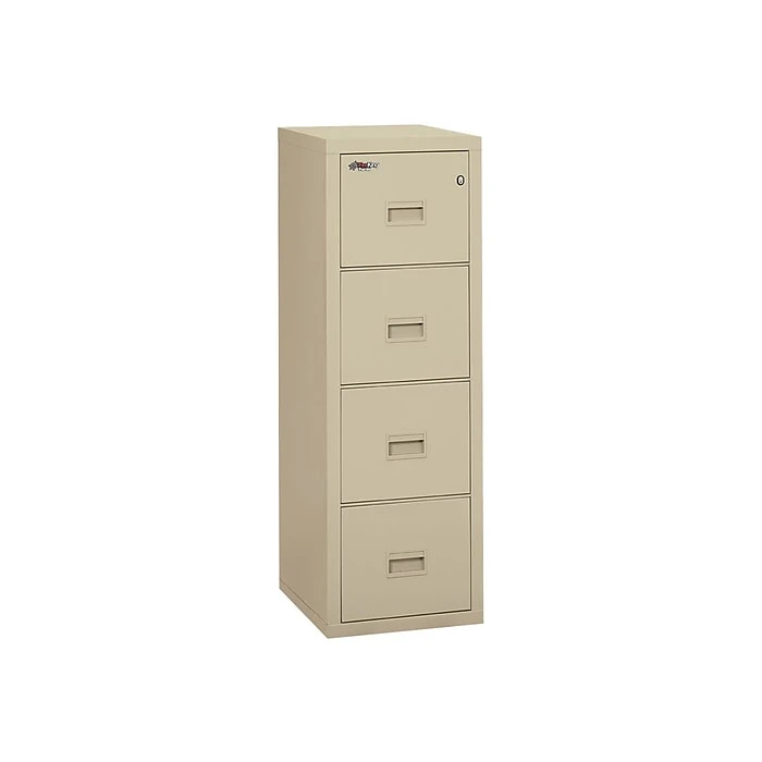 Store important paperwork in this FireKing vertical four-drawer fire-resistant file cabinet. The integrated lock prevents unauthorized access to sensitive documents, while the four spacious drawers maximize file storage space. A UL one-hour fire rating and water-resistant design defends your documents from damage during emergencies. This FireKing vertical four-drawer fire-resistant file cabinet boasts durable metal construction to withstand everyday wear and tear.
