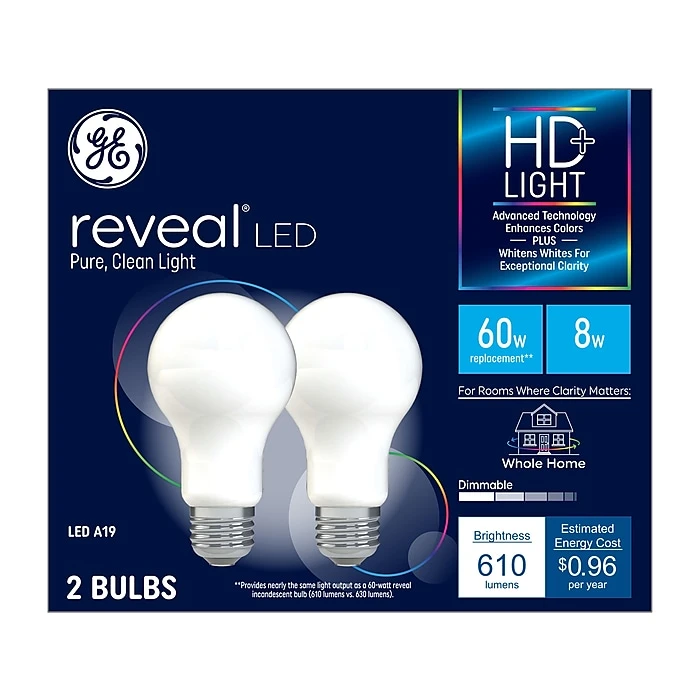 The GE Reveal HD+ LED 60W replacement A19 light bulb provides pure, clean light. The advanced technology enhances colors plus whitens white for exceptional clarity. Replace ordinary bulbs with Reveal HD+ to see vivid colors and vibrant whites in high definition. The bulb is dimmable and illuminates your home with clean, beautiful light. Unlike CFL bulbs, Reveal HD+ features exceptional color, instant full brightness, and is free of mercury. Replace CFL and incandescent light bulbs with the Reveal HD+ general-purpose light bulb in indoor table lamps, sconces, and open fixtures, including damp locations. Use this bulb where clarity matters, especially in kitchens, bathrooms, and craft and hobby spaces.
