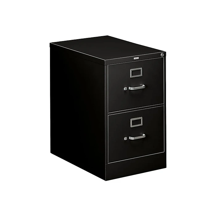 Get legal-size and other documents well-organized in this two-drawer filing cabinet. Built-in label holders let you easily identify stored records, and a tilt and slide follower block in each drawer keeps files upright and neat. This HON 310 series vertical file cabinet has thumb latches and a replaceable lock for secure closure, and the steel ball bearing suspension system lets the drawers glide smoothly.