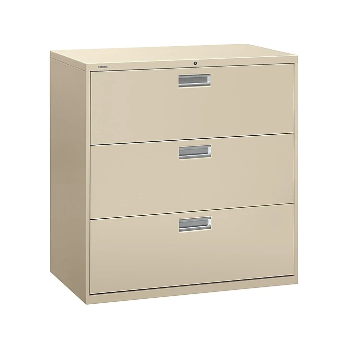 Keep paperwork organized with this HON 600 series three-drawer lateral file cabinet. Its durable steel frame can stand up to everyday use, and the three drawers operate smoothly and quietly thanks to ball bearing suspensions, while a mechanical interlock prevents multiple drawers from opening at the same time. With a two-sided lock mechanism and removable lock core, this HON Brigade 600 series lateral file keeps sensitive documents securely tucked away.