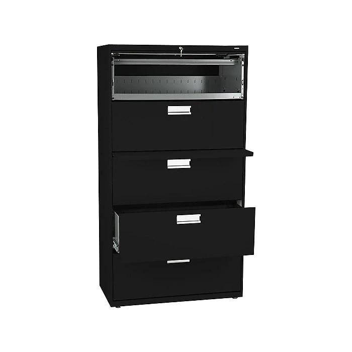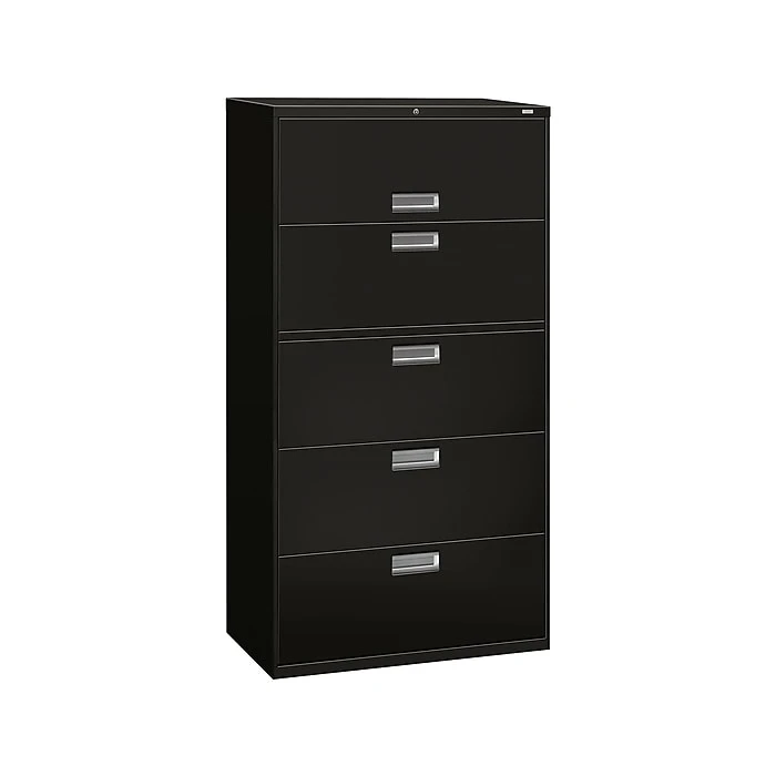 Organize important files and documents with this five-drawer lateral file cabinet. The integrated two-sided locking mechanism prevents unauthorized entry, and the built-in counterweight prevents the cabinet from tipping forward when the drawers are fully extended. This HON Brigade 600 lateral file has heavy-duty steel ball bearings that makes the drawers easy to open and close, and the all-welded case helps the cabinet stand up to commercial environments.