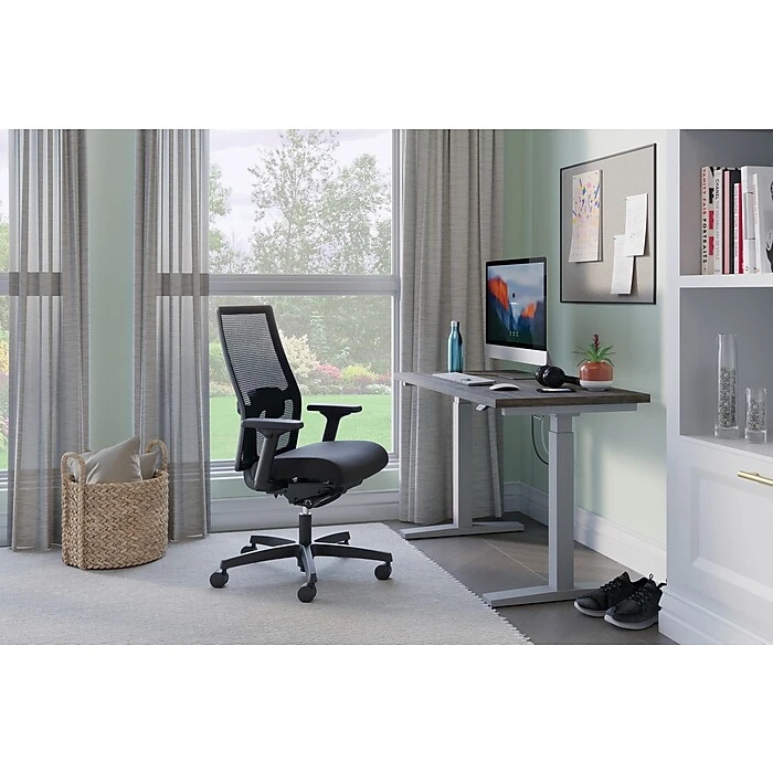 Getting exactly what you want has never been this easy. Take your home office to new heights and land in the perfect comfort zone with this desk and chair combination designed for ultimate productivity. Sit, stand, and repeat all at the touch of a button with a height-adjustable HON Coze desk that offers contemporary style and plenty of support. Set up is a breeze, meaning you’ll be ready to face the workday in mere minutes. Look great and feel even better in this contemporary HON Ignition task chair, designed for easy assembly and optimal comfort. An array of ergonomic adjustments provides precise support right where you need it, while a breathable mesh back flexes and moves with you to keep the air and your ideas flowing freely. Laminate and edgeband are Florence walnut. Chair mesh is black.