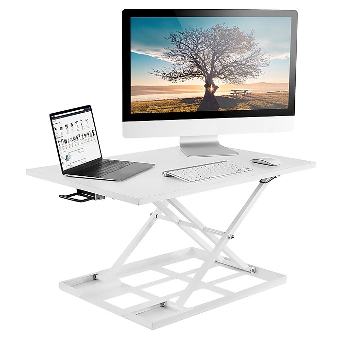 This pre-assembled sit-stand desk converter is ready to go right out of the box! Simply set it on top of your existing desk and raise it up to 17″ tall with to the smooth, gas spring design. The large 32″ W x 22″ D top surface provides a spacious work area, and this stand-up workstation carries up to 20 lbs. You will be able to improve your workday with an ergonomic experience by just standing up!