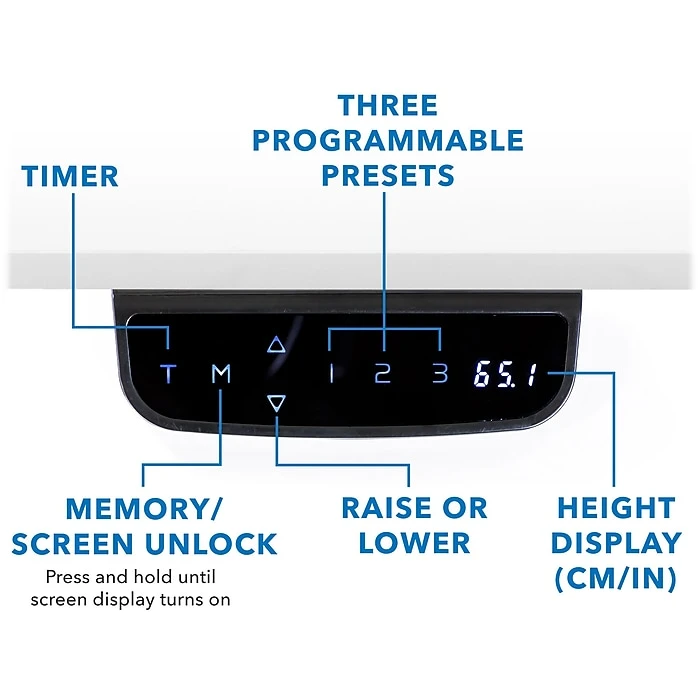 Benefit from reduced stress to your neck, shoulders, and wrists by using the Mount-It! dual-motor electric standing desk to transform your traditional desk into an ergonomic workstation. You’ll feel the difference right away. The advanced touch-screen control panel has three customizable height presets, so you can save your favorite seated and standing heights. The dual electric motors provide high load-bearing capacity and smooth height adjustment. Plus, they’re thermal- and overload-protected for increased safety and longevity while you work. An integrated sensing technology detects both hard and soft objects in the movement path to avoid any unwanted damage. Select your favorite tabletop, and install it on this desk to complete your setup. The tabletop is easily cleanable with a damp cloth.