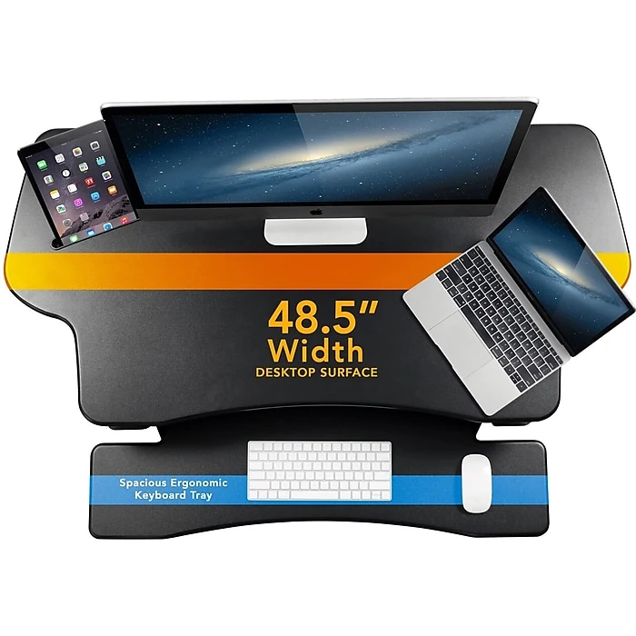This Mount-It! desk converter works out of the box on top of your existing desk. The powerful electric motor adjusts the height from 6″ all the way up to 19.25.” A spacious tabletop measures 48.5,” and the keyboard tray measures 35.5″, so you can use keyboard and mouse side-by-side, two monitors, laptop, tablet, and more. Increase your efficiency by adding a dual monitor mount to this desk to free up even more space.