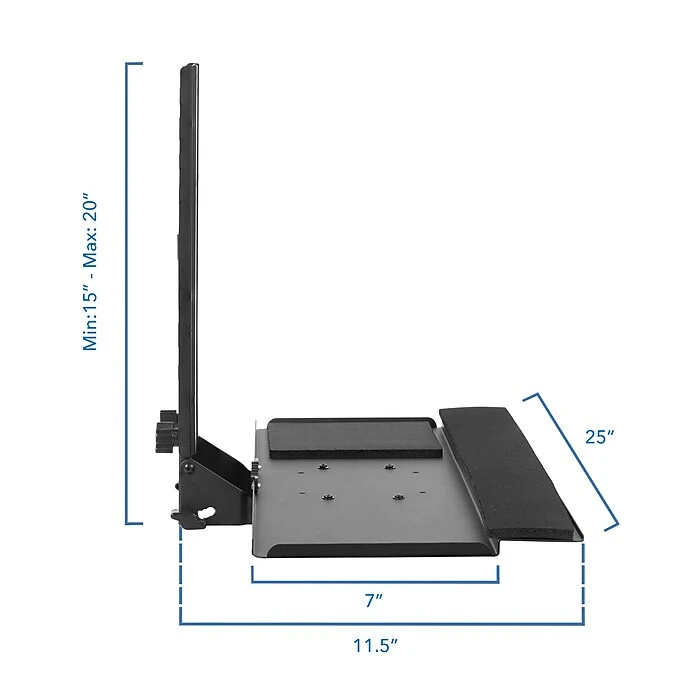- The 25″ floating platform tray is wide enough for your keyboard and a mouse, can tilt downward up to 25 degrees, and is height adjustable up to 5″.