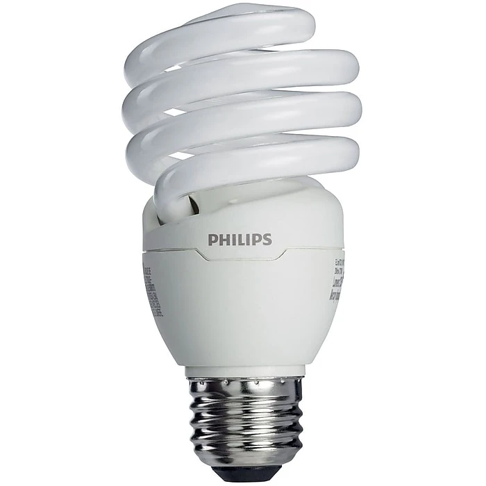 The Philips® Compact Fluorescent Light Bulb has 23 watts for smaller light fixtures in your home or office. The medium screw base fits in most fixtures with ease. The twister shape enhances the look of the bulb. For your convenience, these bulbs are sold six per package. d six per package.