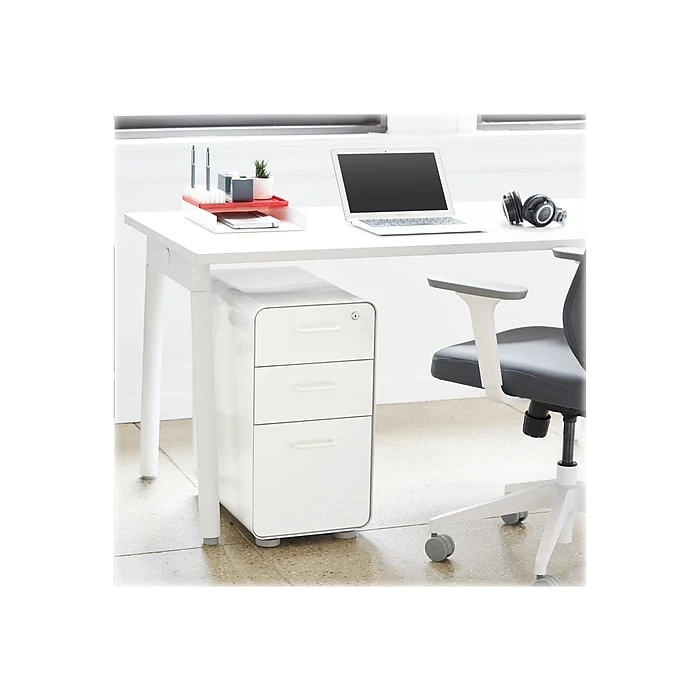 This Poppin slim stow file cabinet is designed for use with 47″ desks, providing plenty of room for both your docs and your knees. The powder-coated steel construction with a peekaboo matching steel interior keeps your stuff super safe. Locking drawers and attachable casters with a full 360-degree swivel are bound to get you locking and rolling.