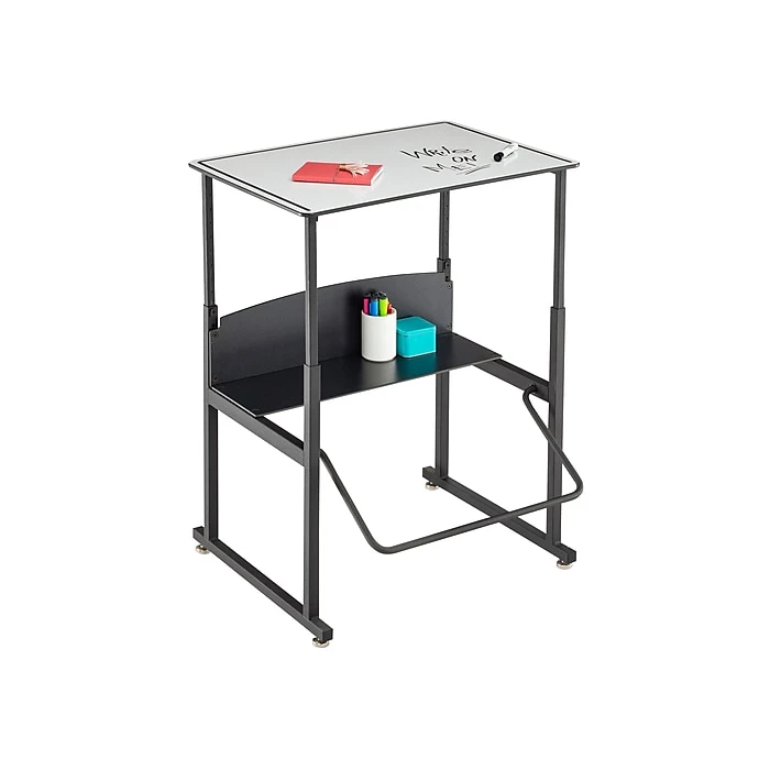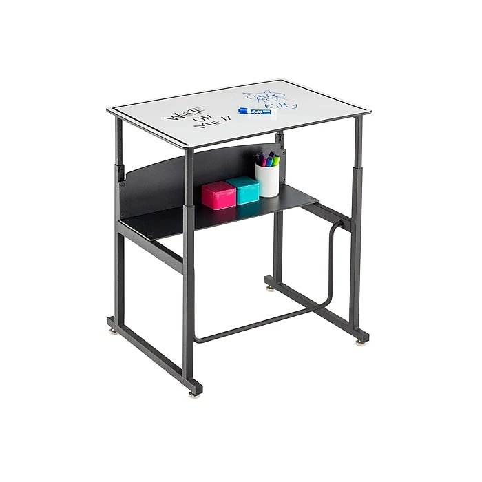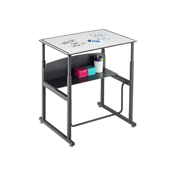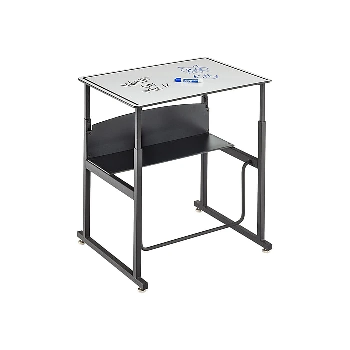 Safco AlphaBetter is an adjustable-height stand-up student desk with swinging footrest (fidget bar). Patented Swinging Pendulum footrest bar allows students to redirect excess energy and engage in continuous motion that may help support ergonomic comfort and cardiovascular health, while potentially increasing calorie burn, productivity, and focus. The desk features adjustable nylon base levelers for stabilization and easy movement across smooth and carpeted floors. Phenolic resin open shelf provides easily accessible storage area for school supplies and personal items.