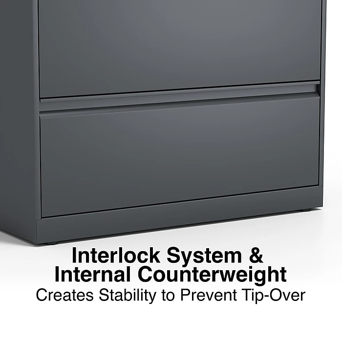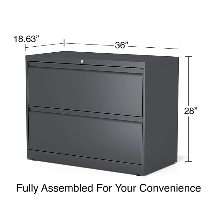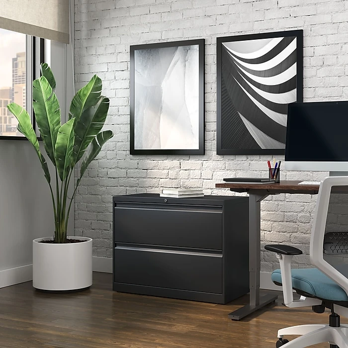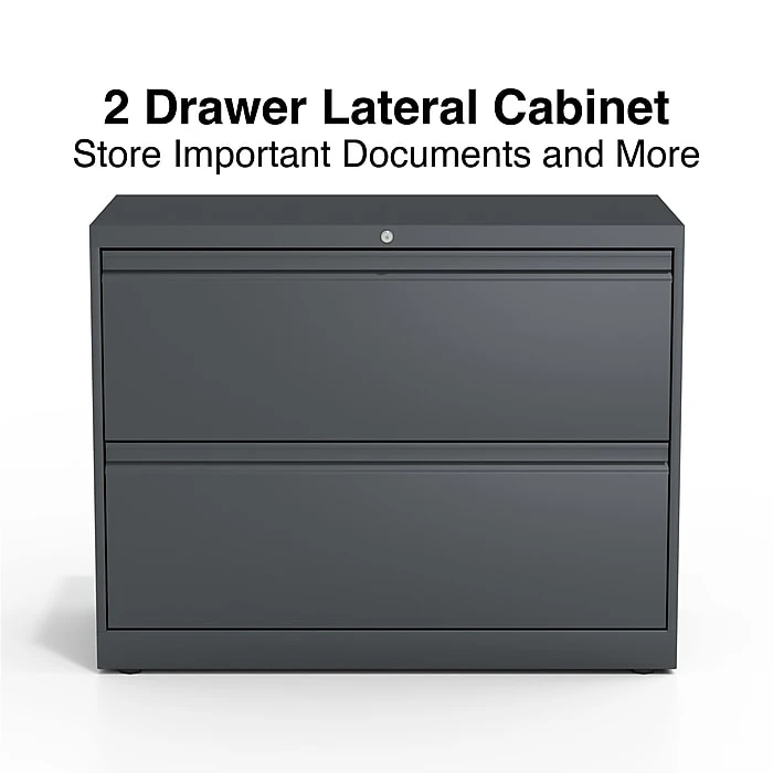 Keep important paperwork neatly organized with this letter/legal lateral file cabinet. Two spacious drawers keep file folders neatly aligned, and the ball-bearing slide suspension makes each drawer easy to open and close. Use the adjustable hang rails for flexible filing options. This letter/legal lateral file cabinet features recessed handles and a neutral black color for a streamlined appearance.