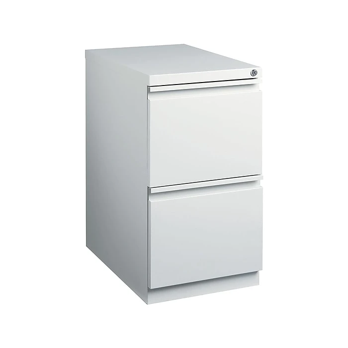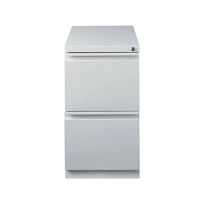Store important documents and keep your workplace organized with this two-drawer mobile pedestal file cabinet. The two deep drawers accommodate large numbers of letter-size documents and have steel ball-bearing suspensions for smooth, easy operation. Featuring a compact design, this cabinet takes up minimal floor space and has concealed casters for easy portability. This two-drawer pedestal file cabinet enhances existing decor with its light gray finish, sleek design and recessed drawer fronts.