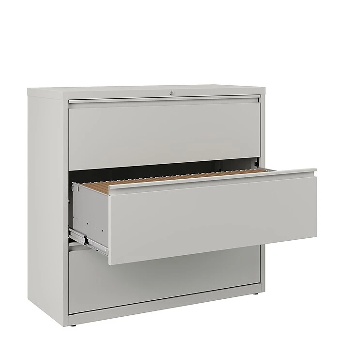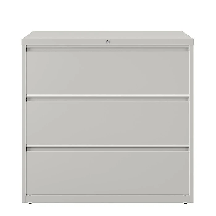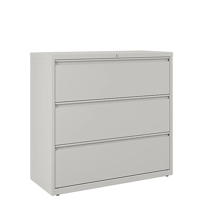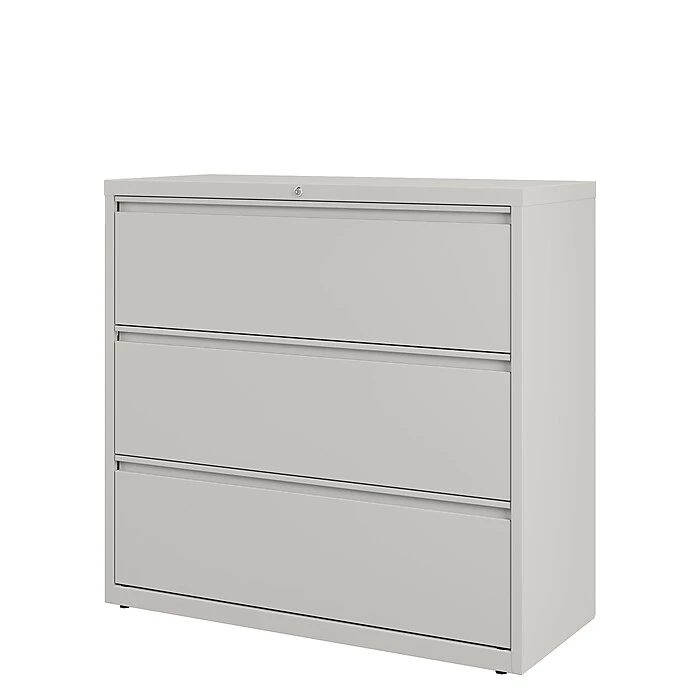 Keep important documents organized and close at hand with this commercial three-drawer lateral file cabinet. Ideal for busy workplaces, this cabinet easily withstands intense use with its scratch-resistant enamel finish and rugged steel construction and presents an unobtrusive appearance with a light gray color and understated design. The three 42-inch-wide drawers offer ample storage space for letter and legal-size files and open and close smoothly with three-piece ball-bearing suspensions. This three-drawer lateral file cabinet makes it easy to secure stored documents with a built-in lock.