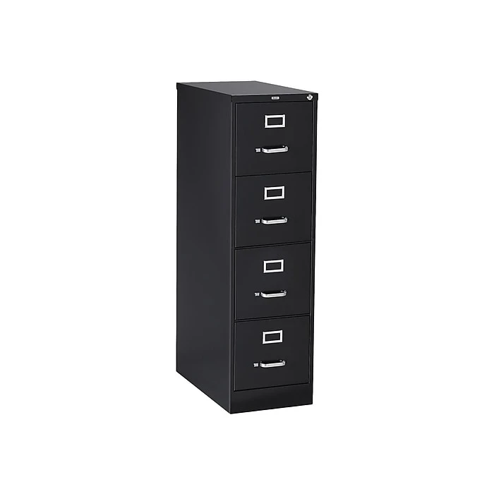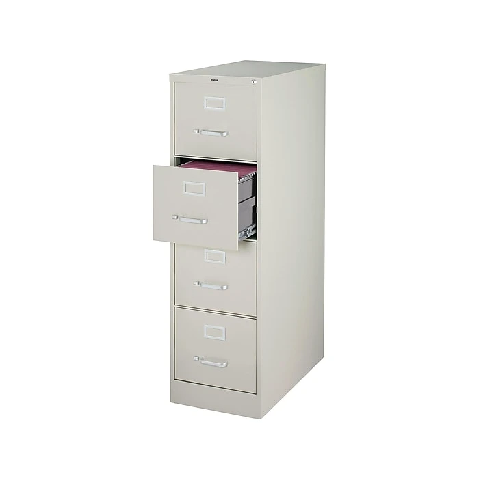 Revamp your filing system with this four-drawer file cabinet. The vertical design takes up minimal floor space, and the light gray color offers a professional look. Each drawer features ball-bearing suspension for smooth opening and closing. This cabinet boasts aluminum frames to hold subject labels, making it easy to identify the contents inside each drawer. With a factory-installed lock and two keys, this letter-size vertical file cabinet restricts access to sensitive documents for added security.