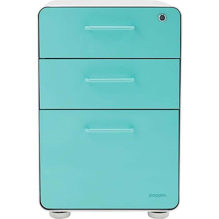 The White & Aqua Stow 3-Drawer File Cabinet with Casters features Aqua powder-coated steel construction with peek-a-boo matching Aqua steel interior. Letter/legal size cabinet includes 2 utility drawers with adjustable drawer-dividers and 1 hanging-file d rawer.