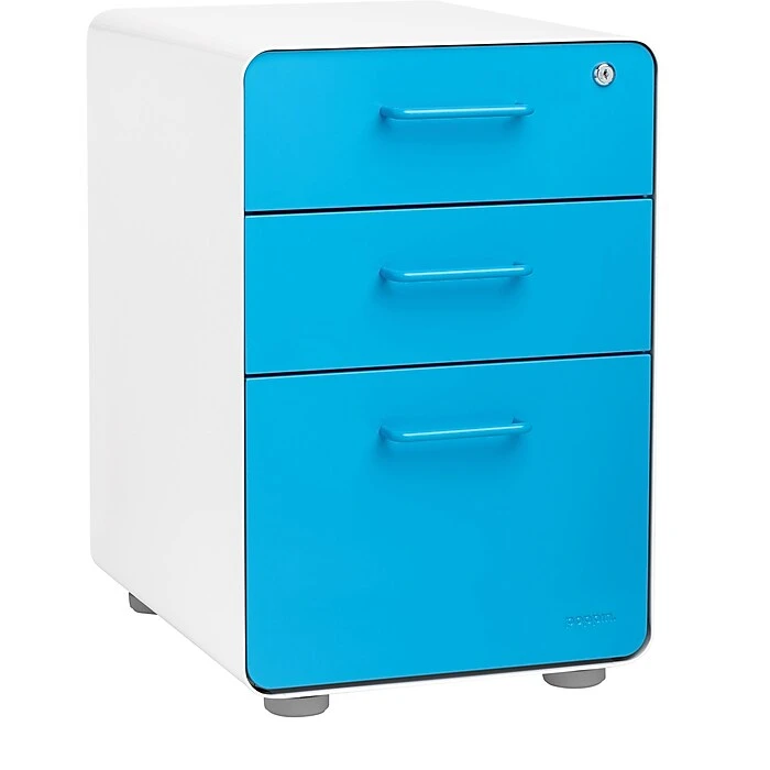 Use this file cabinet for your filing needs with its hanging file drawer with glides, which allow you to search for documents easily in either direction. Its modern design has rounded corners with white sides and a light blue front that looks great in m ost office spaces. One lock secures all three drawers keeping contents private and secure.